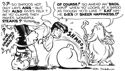 What the Shmoos offer mankind is a life free of want. Human economy is built around scarcity and we work presumably so that we can fulfill our needs and perhaps even our wants. But what if each human was suddenly free of the need to scour for needs? What if we had our basic desires available to us at no cost the save perhaps the labor we invest in acquiring them now. Well according to Al Capp, the Shmoos can offer mankind an endless supply of tasty morsels from their own bodies and when they are broiled they taste like steak, boiled like ham, and give us eggs and butter and more besides.